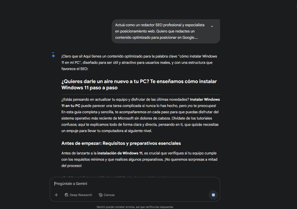 Gemini también te permite crear y optimizar contenidos SEO de una manera rápida y profesional.